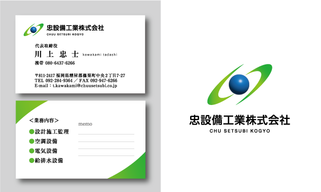 忠設備工業様のロゴとお名刺を作成させて頂きました。水や空気のイメージとして緑と青をベースに、清涼感と丁寧な印象を与えるロゴデザインをご提案させていただきました。