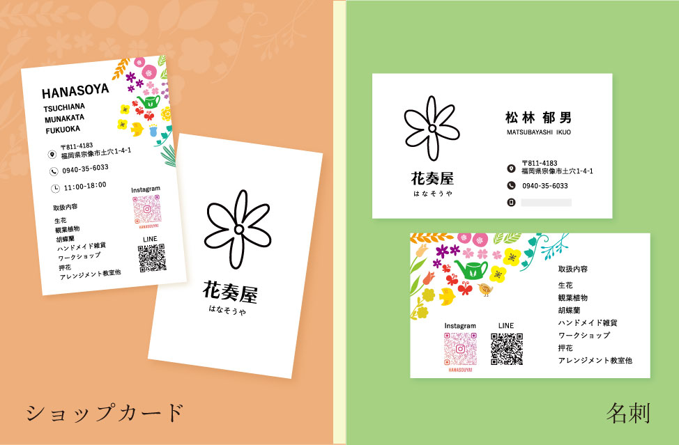 4月1日、宗像市土穴にオープンされた「花奏屋(はなそうや)」様の名刺とショップカードのデザイン・印刷をお手伝いさせていただきました。