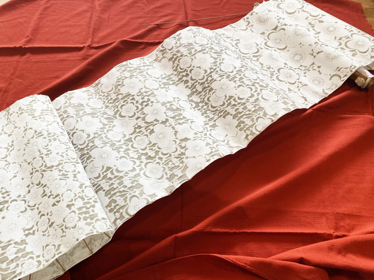 また、施工にはデザインを行なったスタッフも同行させていただき、うめばやし様がされている「型絵染」も見学させていただきました。