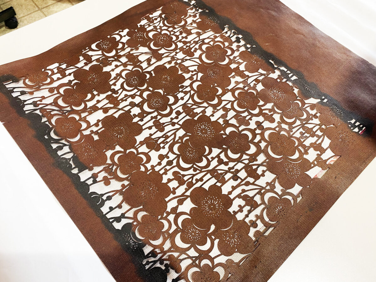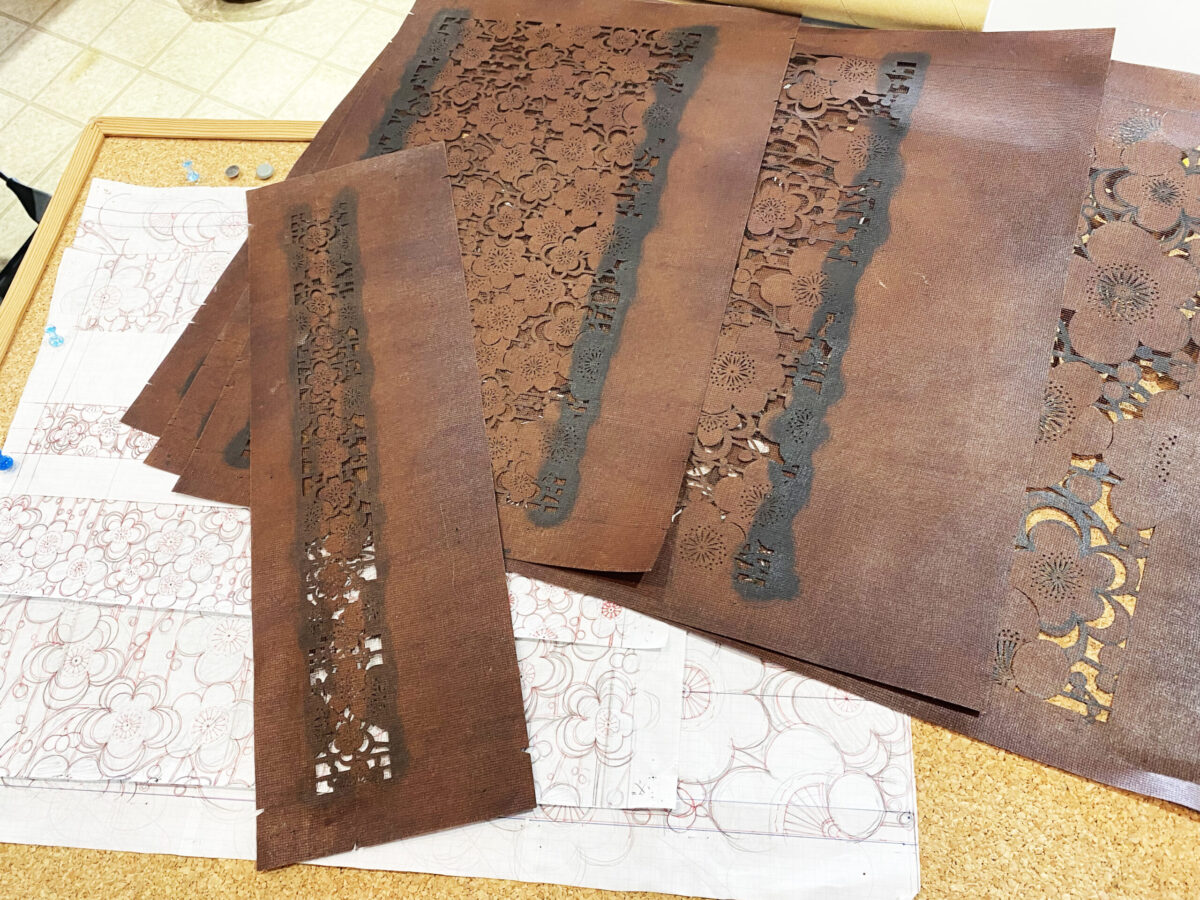 手書きで描いた柄を、和紙を重ねた茶色の型に写し、それを手作業でくり抜き、糊付けし、染めるといった工程を踏まれるそうです。最終的には、4枚目のような素敵な色味に仕上がります。