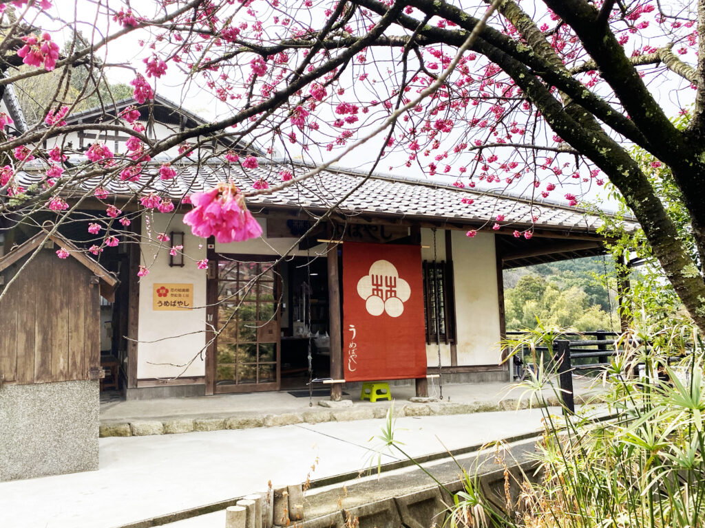 うめばやしさまの梅色のロゴマークが木目とぴったりで、古民家のような優しいお家の外観にもとってもマッチしますね!