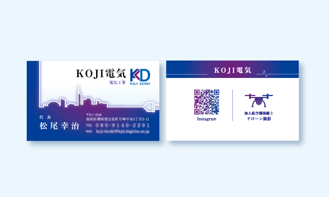 KOJI電気様のロゴとお名刺を制作させて頂きました。お客様のアイデアを元に、相談しながら青と紫の掛け合わせで色を決定。プラグの仕切り線で福岡の街並みを描き、特別なお名刺が完成しました。台紙のシェルは、光に当たるとキラキラと光ります。【今回のお名刺】デザイン:オリジナルプラン刷 色:両面カラー台 紙:シェル