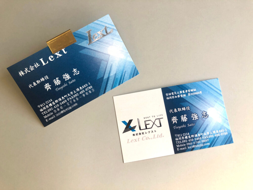 お名刺は、会社の未来が輝くように願いを込めて、細やかなラメが入った「シェル」という台紙を使用し、イメージカラーの青をベースに光と光が交差するLext様らしいデザインとしております。