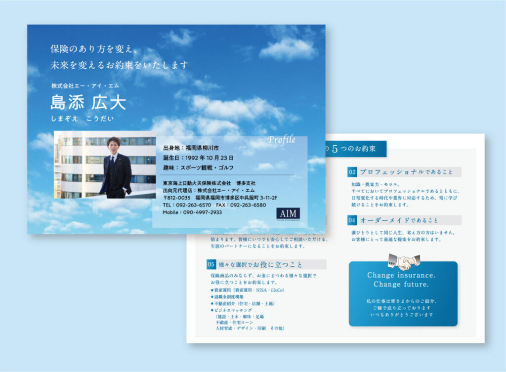 お話しさせていただいた時に感じた島添様のイメージに合うように、空やブルーのグラデーションを使用しデザインいたしました。
