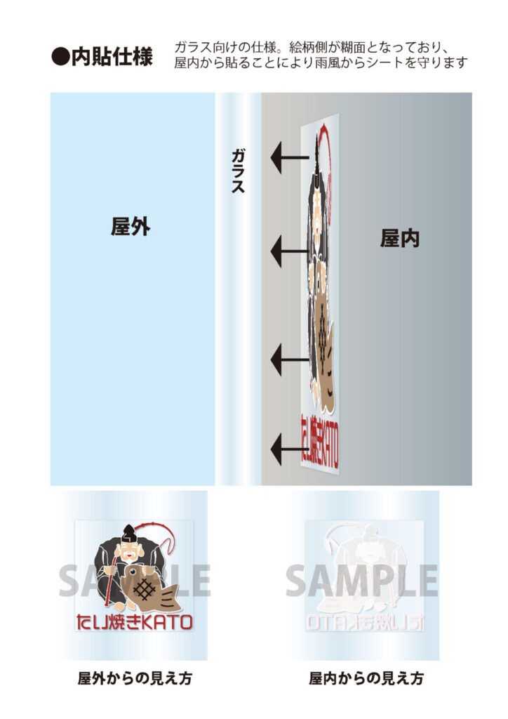 ガラス用サインは透明な一枚のシールとなっており、絵柄の後ろに白引きをすることで透かせず発色させることができるようになっています。色数が多く、ガラスに貼る際はおすすめの商品です。