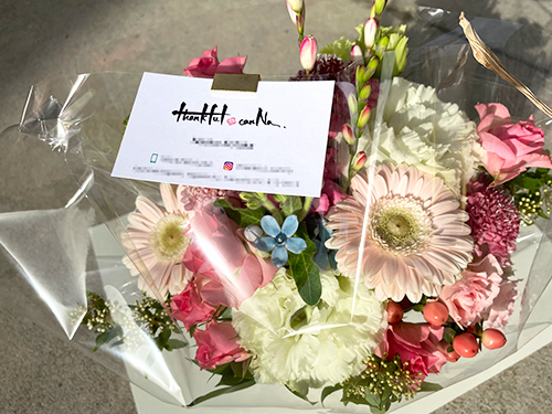 こちらは、Thankful canNa様の大ファンであるスタッフが、個人的に注文させていただいたお花です。たくさんの種類のお花があり、カラフルでとっても素敵です!!お花だけではなく、花瓶や梱包の仕方など、細かいところまで気配りがされており、ますますファンになりました。